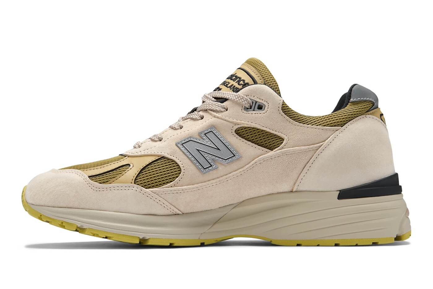 The 991v2 carries the pack’s design DNA but applies it to a lighter, almost mineral palette: a neutral beige base is complemented by algae tones. The characteristic rectangular sandwich mesh once again forms the foundation, layered with pigsuede and synthetic accents.