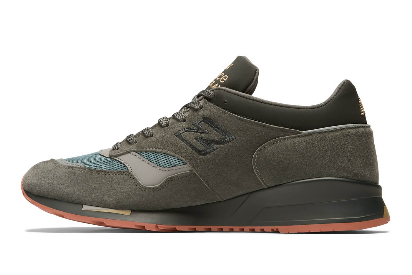 The 1500 adopts a darker, urban-grounded palette: shades of blue and grey are paired with a rust-coloured outsole that echoes the look of weathered metal surfaces.